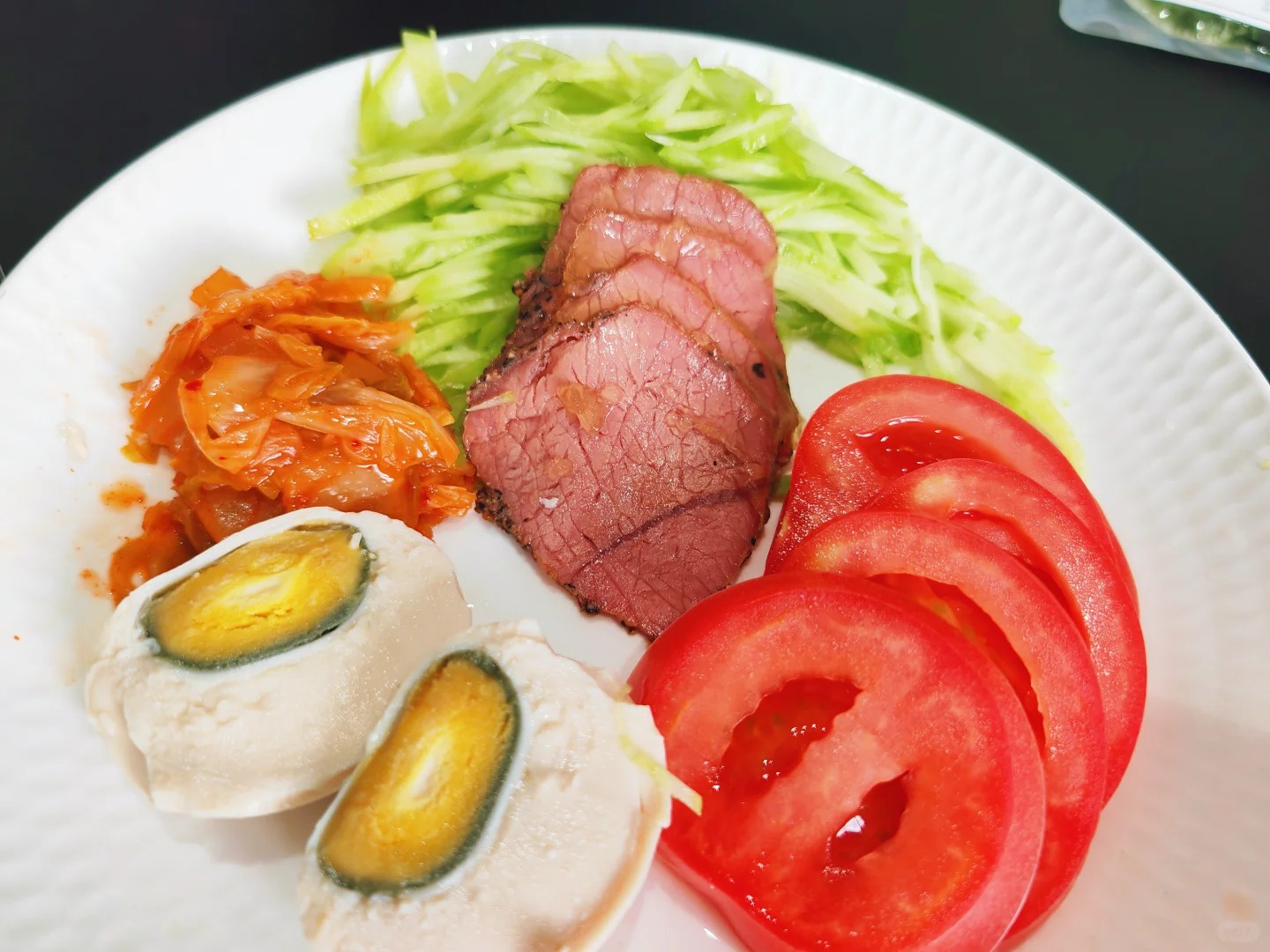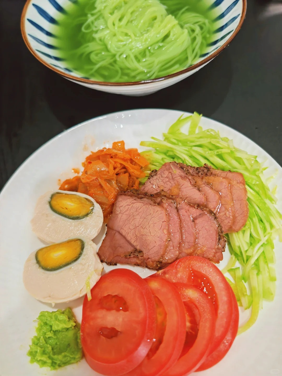 山葵冷面一份,精选熟牛肉片适量增香,鲜嫩西红柿一个添彩,熟鸡蛋一枚(溏心蛋口感更佳),辣白菜一包提味
